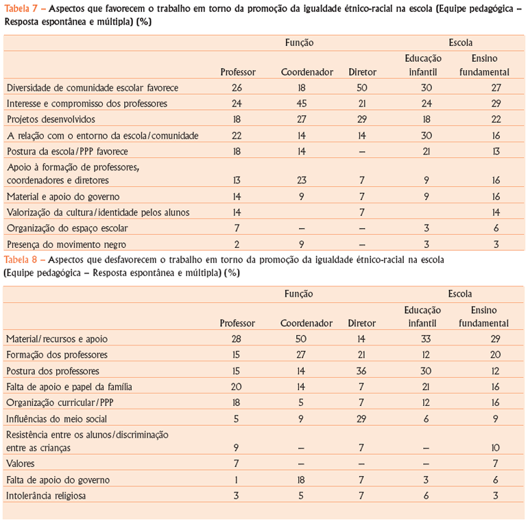 Para compreender melhor as possibilidades de implementação a Lei no 10.639/2003 de forma mais eficaz no sistema educacional brasileiro, a consulta pediu aos profissionais da equipe pedagógica que mencionassem os aspectos que hoje favorecem e desfavorecem o trabalho em torno da promoção da igualdade das relações étnico-raciais na escola. As Tabelas 7 e 8 apresentam as respostas.