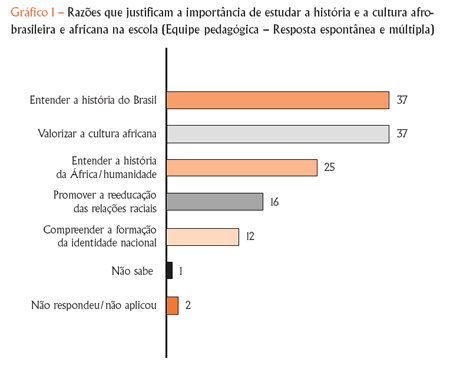Nas escolas pesquisadas por esta consulta há um conhecimento da Lei n o 10.639/2003 bastante disseminado entre a equipe pedagógica (professores, diretores e coordenadores pedagógicos), uma vez que 70% dizem conhecer a lei e 22%, já ter ouvido falar sobre ela. Isso significa que, independentemente da existência ou não de críticas no que se refere à inclusão da temática da história e da cultura afro-brasileira e africana no currículo oficial, a obrigatoriedade que, como já citado, altera a LDB impulsionou o debate sobre sua existência. Em compasso com o conhecimento da existência do dispositivo, a maioria dos profissionais da equipe pedagógica (96%) afirma a importância de estudar a história e a cultura afro-brasileira e africana na escola. Atribuem essa importância aos fatores que serão verificados nas próximas páginas.