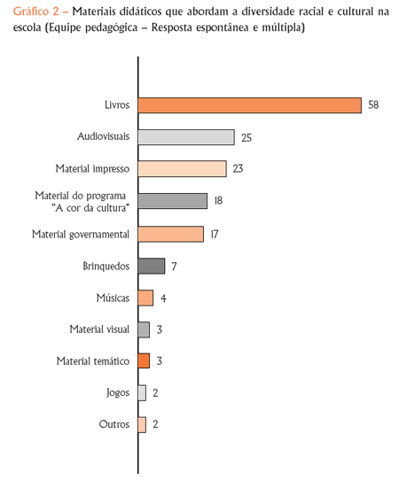 É importante mencionar que análises têm apontado que a abordagem do material promove o paradigma do mito da democracia racial, pois, ao fazer a apologia da miscigenação, tende a minimizar a existência do conflito racial. De todo modo, é bastante promissora a citação espontânea de número bastante elevado de títulos de literatura, o que pode sinalizar que, com a ampliação da oferta de títulos sobre a história e a cultura afro-brasileira e africana por parte do poder público, as escolas podem se apropriar desse repertório, uma vez que o livro é bastante valorizado.