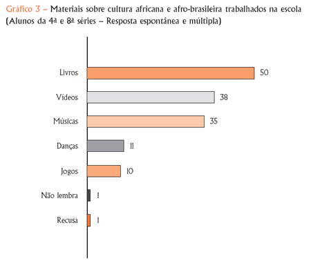 A equipe pedagógica também respondeu, por meio de cartão impresso, se havia em sua escola os seguintes títulos: Alfabeto negro (de Cristina Agostinho e Rosa Margarida C. Rocha), Almanaque pedagógico afro-brasileiro (de Rosa Margarida C. Rocha), A África está em nós (de Roberto Emerson C. Benjamin), Bonecas negras, cadê? – O negro no currículo escolar (de Maria Zilá Teixeira de Matos) e Ilê Ifé, o sonho do Iaô Afonjá – Mitos afro-brasileiros (de Vanda Machado e Carlos Petrovich), que fazem parte de catálogo bibliográfico e de um conjunto de livros que abordam as questões étnico-raciais, distribuídos nas três cidades como indicação de leitura e dinamização na escola.