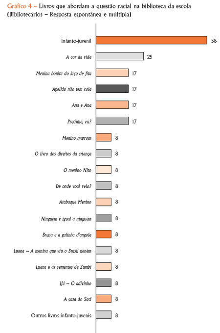 Ainda que não apresentem o mesmo repertório que as bibliotecárias entrevistadas, 76% dos professores, diretores e coordenadores pedagógicos afirmaram a existência de livros infanto-juvenis em suas respectivas escolas, citando espontaneamente os seguintes títulos em ordem decrescente: Menina bonita do laço de fita (de Ana Maria Machado), As tranças de Bintou (de Anna Sylviane Diouf), Pretinha, eu? (de Júlio Emílio Braz), Luana (de Haroldo Machado), Lendas e contos africanos e Tanto, tanto! (de Trish Cooke), A bonequinha preta (de Alaíde Lisboa de Oliveira) e Histórias da preta (de Heloisa Pires). Assinala-se que Menina bonita do laço de fita é uma obra bastante lembrada tanto pela equipe pedagógica como pelas bibliotecárias.