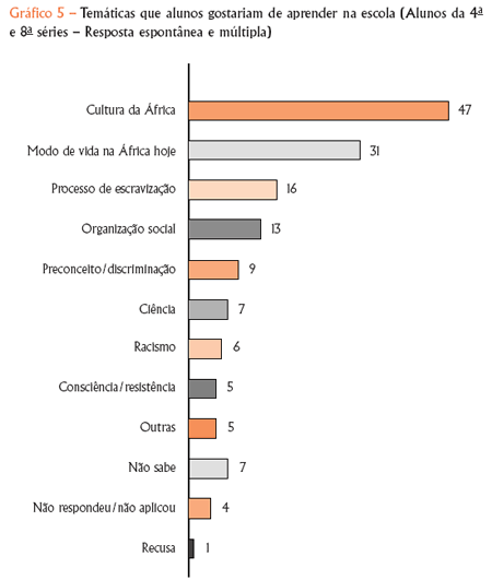 Alunos da 4a e 8a séries mostram expressiva lucidez e capacidade de verbalização ao responderem o que gostariam de aprender da história e da cultura afro-brasileira e africana, trazendo questões importantes e abordagens interessantes que até mesmo extrapolam as dimensões de história e cultura, conforme mostra o Gráfico 5.