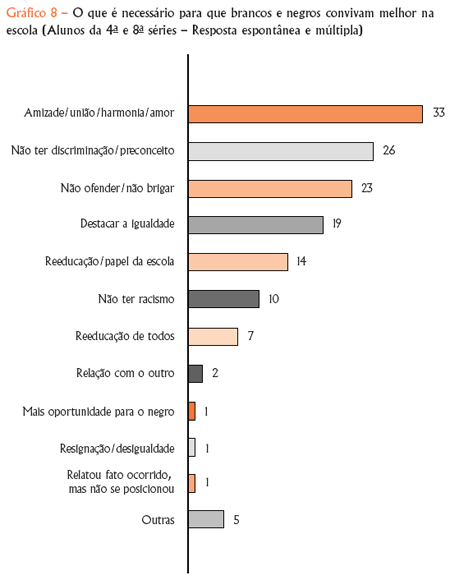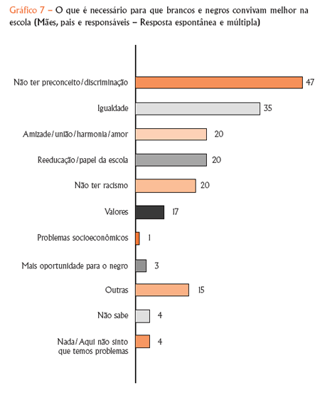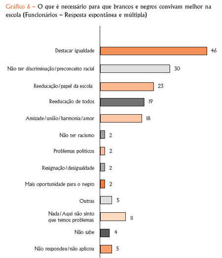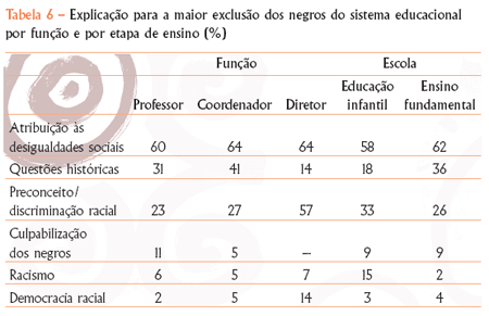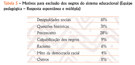 Praticamente dois terços da equipe pedagógica apontam a explicação para a situação com foco na desigualdade social com referência à situação de classe, e um número muito menor atribui essa realidade a aspectos históricos, ao racismo, ao mito da democracia racial ou aos efeitos do preconceito racial. Chama a atenção que 9% chegam a culpar os negros por essa situação, afirmando, por exemplo, que “os negros são mais preconceituosos que os brancos, eles mesmos se sentem inferiores e derrotados”.