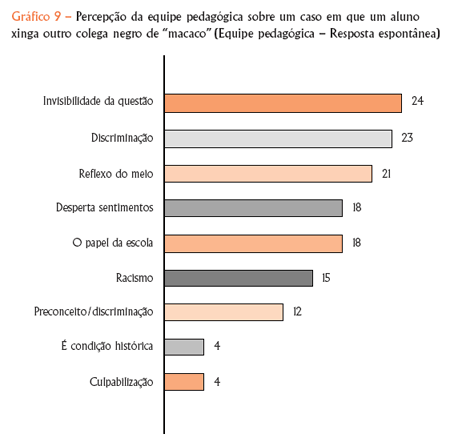 A questão foi aprofundada na equipe pedagógica quando a consulta apresentou uma situação hipotética de discriminação racial em que um aluno xingava outro colega negro de “macaco”. A consulta quis saber o que pensavam de tal situação. Ainda que 50% reconheçam o caso como manifestação de racismo, preconceito ou discriminação, 24% das explicações pelo ocorrido tendem a invisibilizar ou suavizar o conflito. Dizem, por exemplo, que “a criança, no meio de outras, não discrimina”, ou “vindo da criança, a gente não pode dar uma ênfase muito grande porque eles usam qualquer nome para ofender”. Uma porcentagem pequena (4%) culpa o menino negro (ver Gráfico 9).