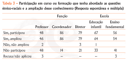 que abordasse as questões étnico-raciais. No entanto, a Tabela 3 mostra que