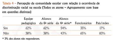 A consulta perguntou a todos os atores da comunidade escolar, com base em questões diferentes, qual era a percepção deles sobre a ocorrência de discriminação racial na escola. Como aponta a Tabela 4, a equipe pedagógica (professores, coordenadores pedagógicos e diretores), bem como os alunos da 8 a série, são os que mais reconhecem a existência de discriminação racial na escola. Essa percepção cai entre os alunos da 4 a série, funcionários, e mais ainda entre os pais, mães e responsáveis. Com relação a estes, a diferença de percepção chama muito a atenção, uma vez que indica a existência de um distanciamento entre o universo escolar e o núcleo familiar. O que a consulta sugere é que a vivência sobre a discriminação racial sentida ou exercida na escola não é compartilhada em casa. Em Salvador, de maneira espantosa, 100% das mães e responsáveis dizem que seu filho não viveu ou presenciou discriminação racial, enquanto 62% dos alunos dizem ter vivido ou visto casos de discriminação racial nessa cidade.